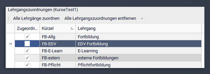 Im Kontext Kurse können Sie zusätzlich im Bereich Lehrgangszuordnungen bestimmen, für welche Lehrgänge die Vorgaben gelten.