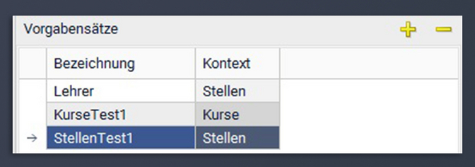 Im ersten Schritt definieren Sie im Programmbereich Dokumentenvorgaben (Menügruppe „Konfiguration Bildungseinrichtung“) den Vorgabensatz und legen fest, ob dieser für Stellen oder Kurse gelten soll.