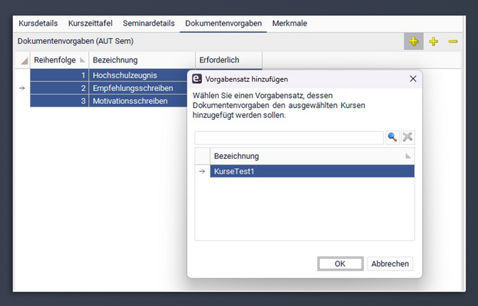 Wechseln Sie zur Menügruppe „Kurse“ im Programmbereich „Details“ und fügen Sie über das Symbol „Doppelplus“ Ihre zuvor erstellten Dokumentenvorgaben hinzu.