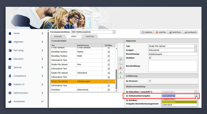 Verknüpfen Sie dazu einfach Dateiupload-Felder mit einer bestimmten Dokumentenvorgabe. Lädt ein Bewerber dann zum Beispiel seinen Lebenslauf über das entsprechende Feld hoch, erkennt easySoft automatisch, dass das Dokument zu den erforderlichen Dokumenten gehört und jetzt vorhanden ist.