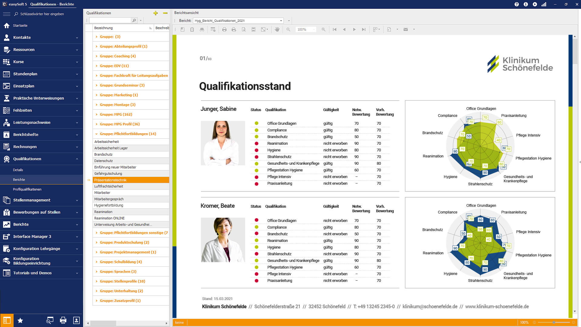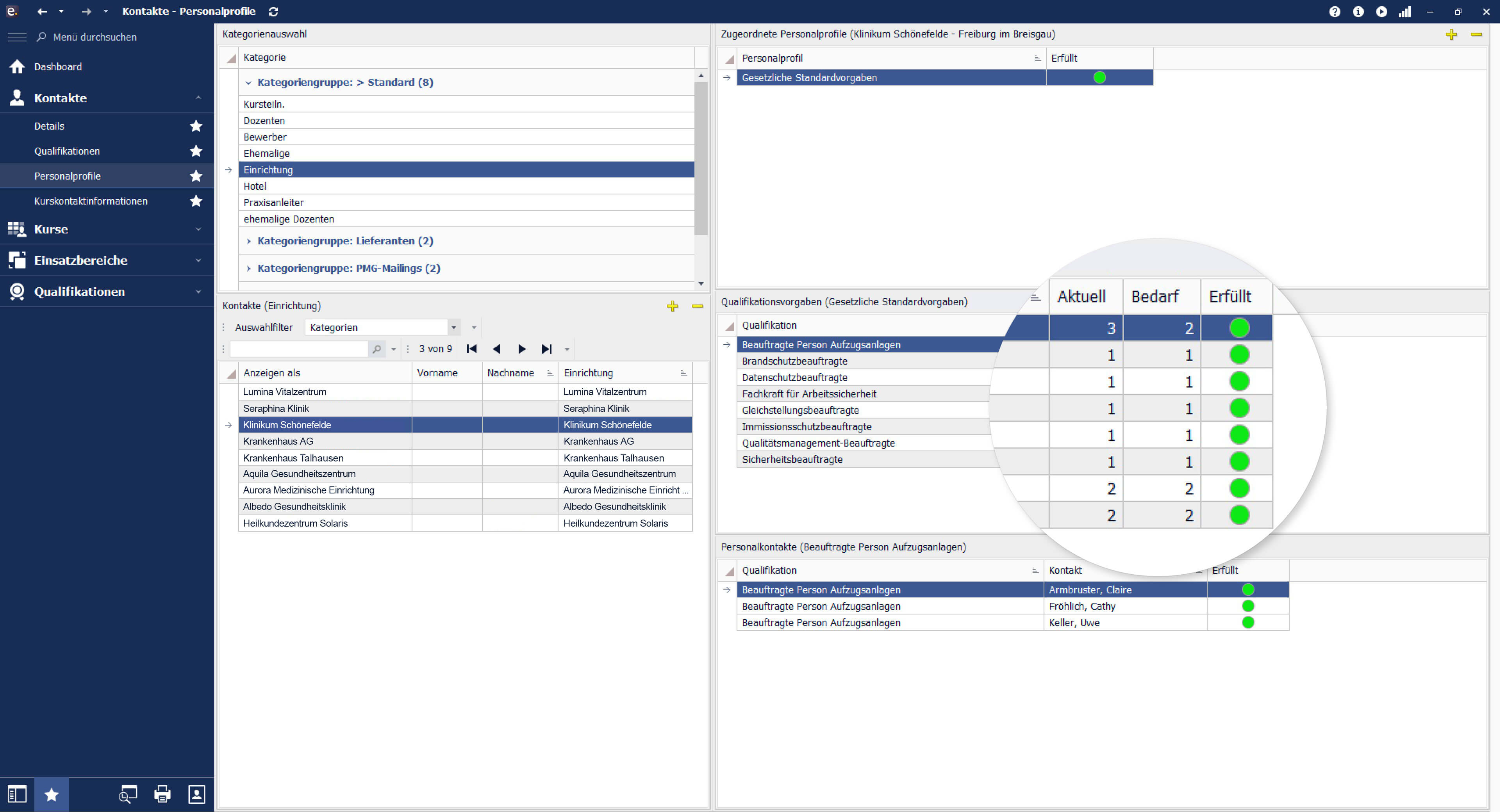 Unser Programm unterstützt Sie auch bei der strategischen Personalentwicklung. Legen Sie fest, welche Qualifikationen für eine bestimmte Stelle in Ihrer Einrichtung wichtig sind (z. B. Zusatzqualifikationen, Fremdsprachen u. v. m.). Anschließend erkennen Sie schnell, bei welchen Personen noch Nachholbedarf besteht, wer demnächst geschult werden sollte und wen Sie gezielt weiterentwickeln können.