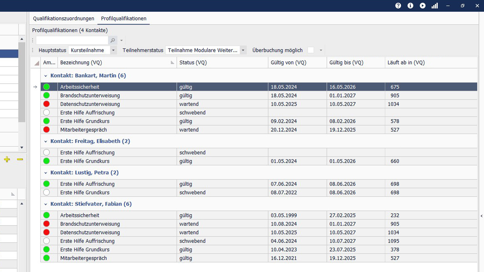 Mit unserer Ampel ist auf einen Blick klar, welche Pflichtqualifikationen Sie in Ihrem Team auffrischen müssen, um alle rechtlichen Vorgaben zu erfüllen.