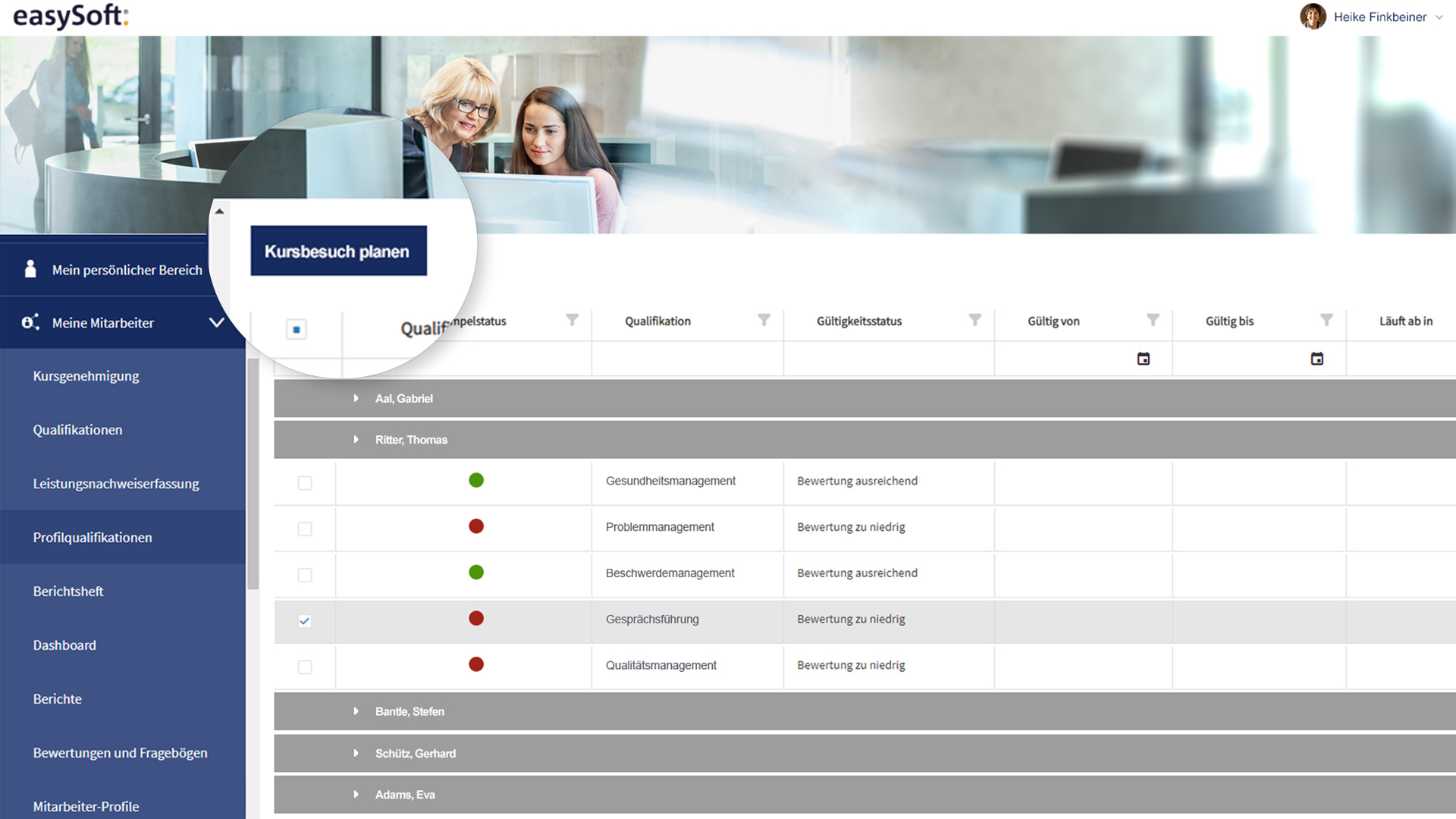 Dort sehen diese den Qualifikationsstand ihres Teams ein und können die zugeordneten Personen direkt in passende Weiterbildungen und Schulungen einbuchen.