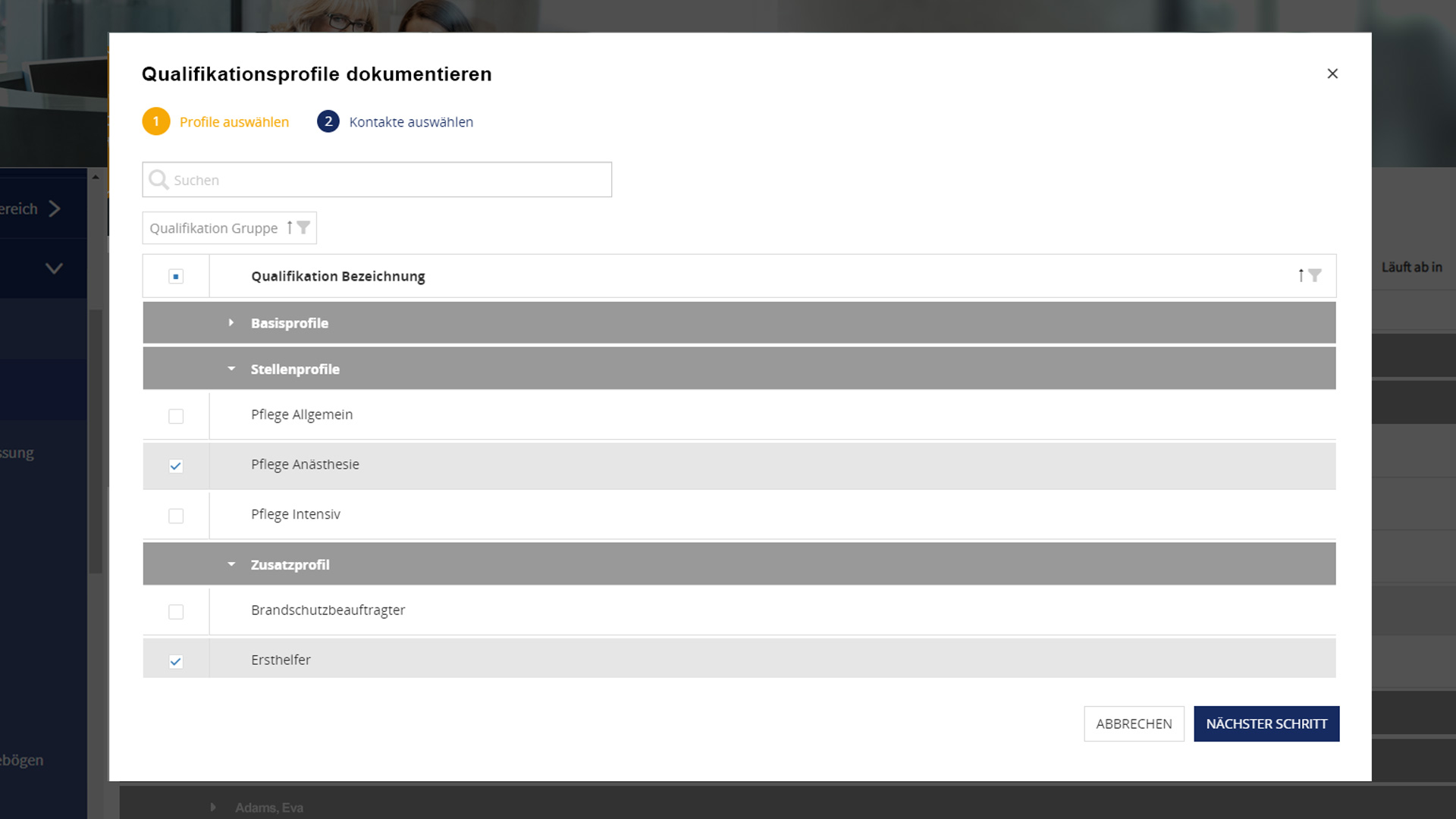 Gesetzliche Pflichtqualifikationen haben Sie verlässlich im Blick. Dafür definieren Sie einmalig die entsprechenden Vorgaben als Profil (z. B. alle Pflegekräfte benötigen jährliche Hygiene-Schulung). Legen Sie nun einen neuen Mitarbeitenden an, weisen Sie das passende Profil zu. Alle Pflichtqualifikationen überträgt das System automatisch auf die Einzelperson.