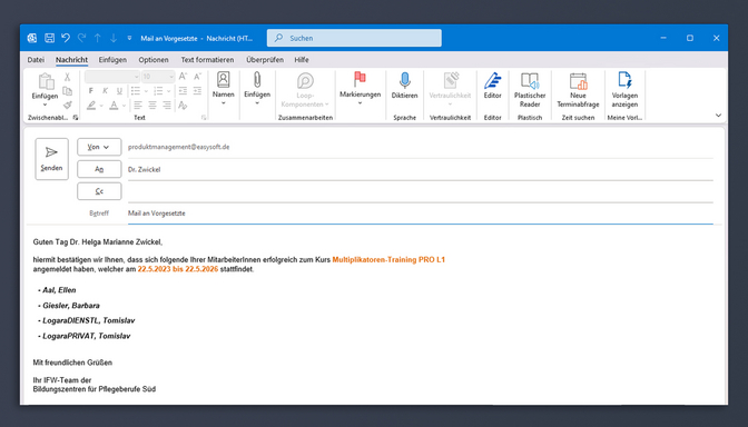 Mit Parametern wie pmKontakt oder pmKurs erstellen Sie ohne großen Aufwand personalisierte E-Mails. Eine integrierte Vorschaufunktion im Serienbenachrichtigungsassistenten ermöglicht es, jede Mitteilung vor dem Versand individuell zu prüfen. So stellen Sie sicher, dass Ihre E-Mails fehlerfrei an die Empfänger gehen.