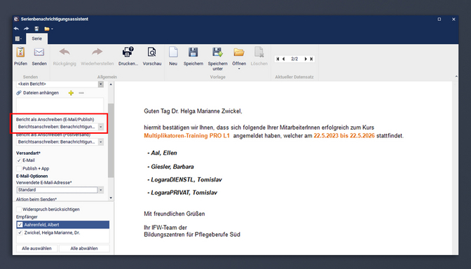 Der Serienbenachrichtungsassistent profitiert damit indirekt von den umfangreichen Funktionen des Berichtsdesigners. Dadurch können Sie vorgefertigte Berichte direkt als HTML-Body (Anschreiben) in Ihre E-Mails einfügen.
