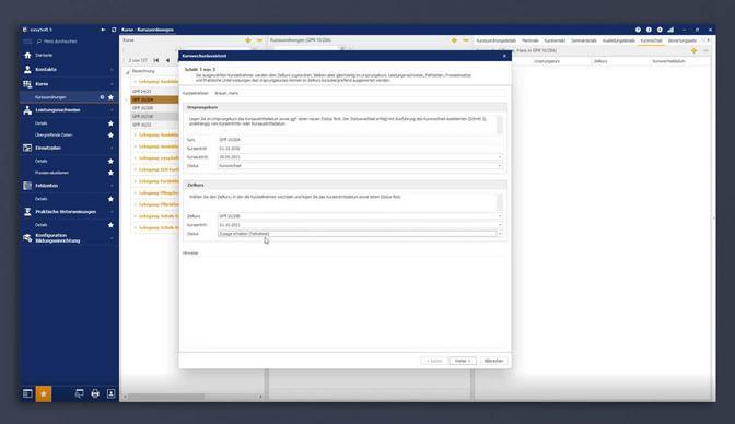 Der Assistent führt Sie anschließend in drei Schritten durch den Kurswechsel. Auf diese Weise stellen Sie sicher, dass alle Daten korrekt gespeichert und weder der Ursprungs- noch der Zielkurs verfälscht werden.