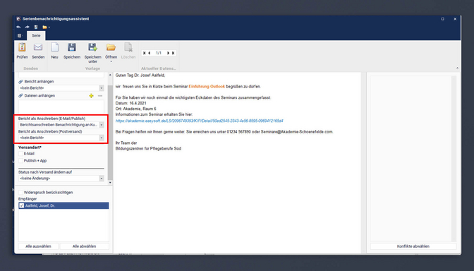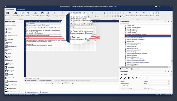 Verwenden Sie den Bericht “Berichtsanschreiben: Benachrichtigung an Kurskontakte mit dyn. Publish-Link.er3” für den Versand über den Serienbenachrichtigungsassistenten, so wird automatisch ein dynamischer Publish-Link zum jeweiligen Kurs ausgegeben. Dieser Link basiert auf dem Formelfeld Link im Bericht.