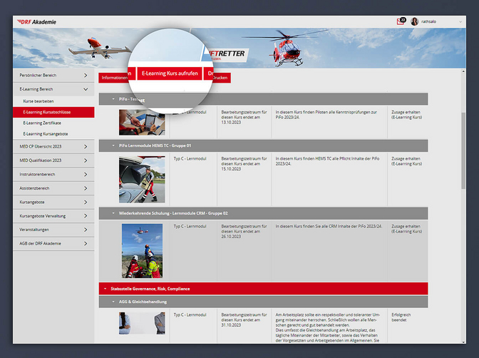 Der Start des passenden E-Learning-Kurses ist direkt aus dem Modul Kursteilnahmen 3.0 möglich.
