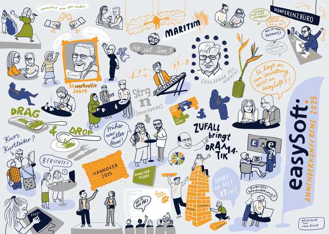 Und noch eine kleine Besonderheit wartete auf die Teilnehmenden in diesem Jahr: Die Illustratorin Lina Ernst begleitete die Anwenderkonferenz und fasste das Geschehen in einem Wimmelbild zusammen.