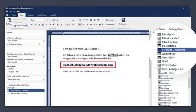 Kleiner Tipp: Nutzen Sie im Serienbenachrichtigungsassistenten das berechnete Feld „Fehlende Dokumente“, das automatisch erkennt, welche Dokumente beim entsprechenden Kontakt noch fehlen oder unvollständig sind und diese ausgibt.