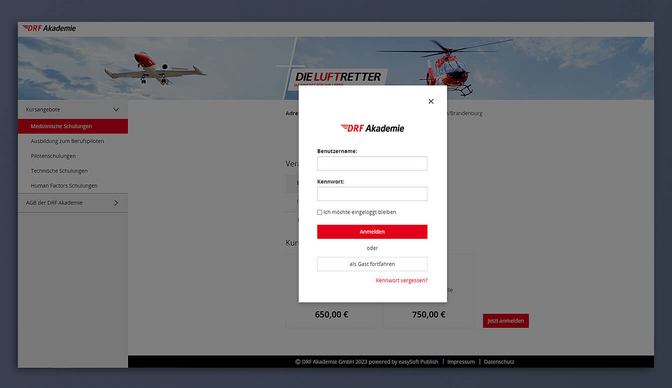 Als Bildungsanbieter kann es für Sie von Vorteil sein, wenn sich Ihre künftigen Seminarteilnehmer registrieren, bevor sie sich zu einem Ihrer Angebote anmelden. Genau diese Funktion nutzt die Akademie der DRF Luftretter bei ihrem Kursangebot.