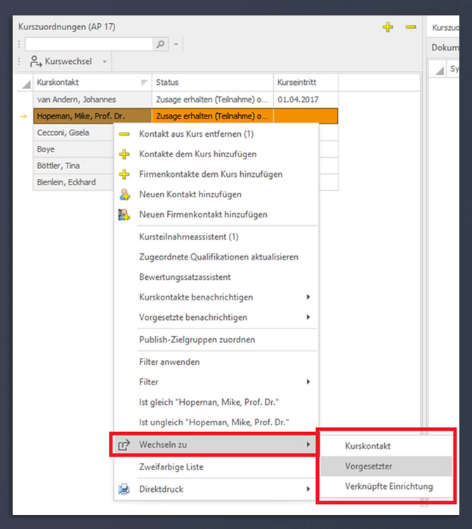 Vom Programmteilbereich Kurszuordnungen der Menügruppe Kurse springen Sie direkt zum ausgewählten Kontakt, dessen Vorgesetzten oder zur verknüpften Einrichtung (siehe Screenshot).