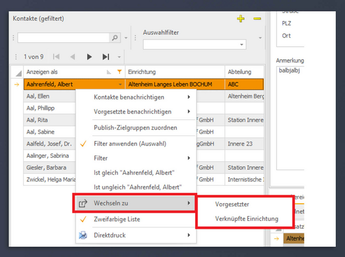 In der Menügruppe Kontakte stehen sie Ihnen im Haupt-Programmteilbereich Kontakte zur Verfügung. Öffnen Sie dort das Kontextmenü mit einem Rechtsklick auf einen ausgewählten Kontakt. An drittunterster Stelle finden Sie den Eintrag „Wechseln zu“ (siehe Screenshot). Dieser gibt Ihnen die Option, zum verknüpften Vorgesetzten oder der zugeordneten Einrichtung zu wechseln.