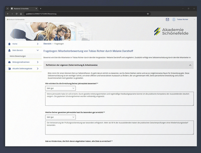 Jetzt sind Ihre Mitarbeitenden und Führungskräfte an der Reihe: In Vorbereitung auf das Mitarbeitergespräch füllen diese die Bewertungsbögen in easySoft Publish aus. Dazu nutzen Sie einfach das Modul “Bewertungen und Fragebögen”.