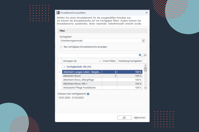 Im Dialog steht Ihnen zudem die Information zur Verfügung, in welchem Zeitraum der entsprechende Einsatzbereich noch freie Plätze hat.