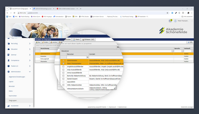 Gehen Sie achtsam mit Zugriffsberechtigungen um. Weisen Sie nur den Personen Administratoren-Rechte zu, die diese zwingend benötigen. Je weniger Accounts umfassende Berechtigungen besitzen, desto geringer ist die Chance für Missbrauch. Die Rechteverwaltung ist unter Administration > Zielgruppen möglich, wo Sie die Zielgruppe „Administratoren“ auswählen und anschließend auf die Schaltfläche „Benutzer“ klicken.