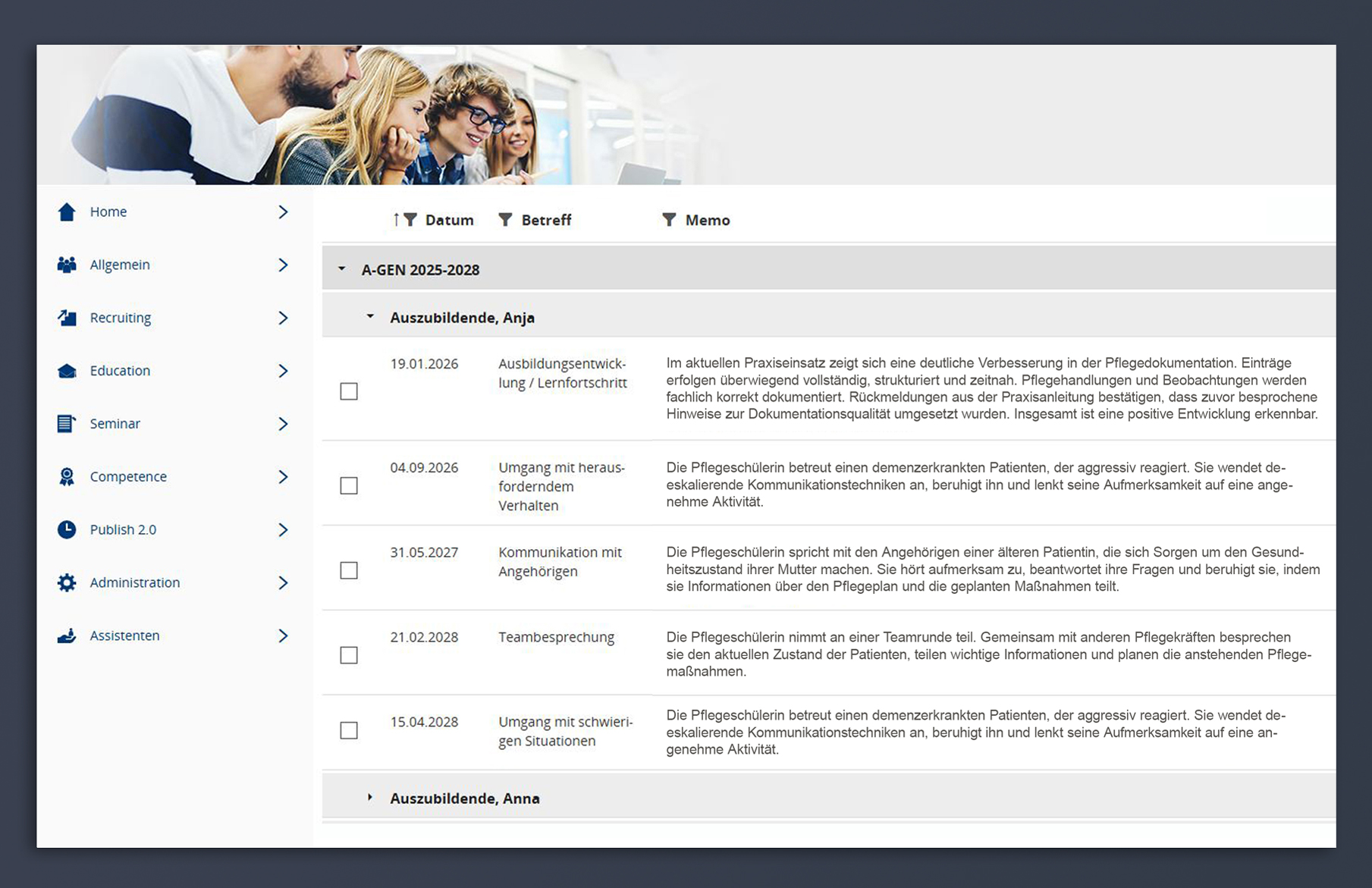 Im Arbeitsalltag fallen täglich Informationen an, die dokumentiert, nachvollziehbar und für Berechtigte einsehbar sein müssen: Gespräche mit Auszubildenden oder Mitarbeitenden, Rückmeldungen aus Praxis- oder Arbeitsbereichen, organisatorische Absprachen oder besondere Vorkommnisse. Genau hier setzen die Vorgänge in easySoft an.