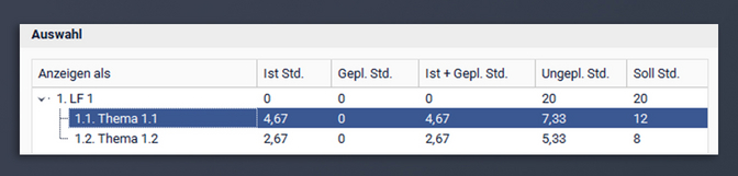- Quelle ist der im Lehrplan hinterlegte Soll-Wert der Lehrplanelemente in Stunden.