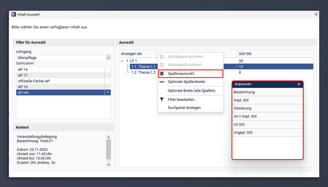 Die Spalten stehen Ihnen sowohl in der Stunden- als auch in der Seminarplanung (Menügruppe Kurse) in identischer Form zur Verfügung. Bei der folgenden Erklärung gehen wir daher nur auf einen beispielhaften Anwendungsfall aus Sicht der Stundenplanung ein.