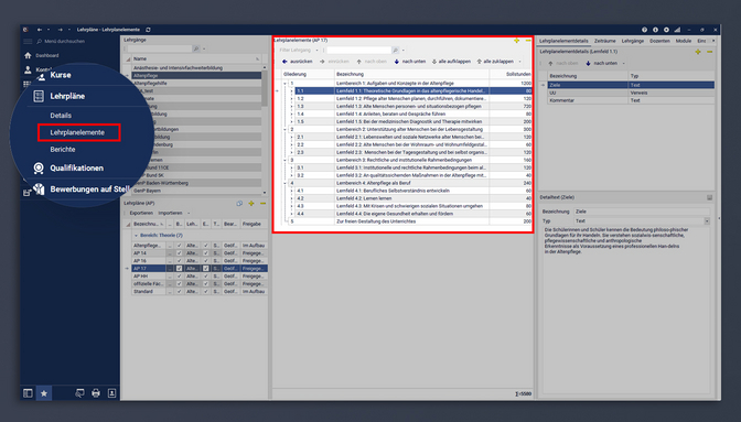 Um die zu verplanenden Stunden zu ermitteln, wird ein dem Kurs hinterlegter Lehrplan vorausgesetzt, der den entsprechenden Soll-Wert beinhaltet. Diesen Soll-Wert definieren Sie in der Menügruppe Lehrpläne, Programmbereich Lehrplanelemente.