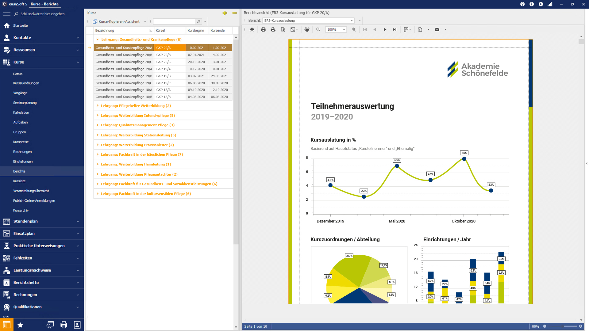 Zum anderen können Sie alle Daten (grafisch) auswerten. Dafür steht Ihnen der integrierte Berichtsdesigner zur Verfügung, mit dem Sie Teilnehmerlisten, Rechnungen, Auslastungsdiagramme, Zertifikate und vieles mehr erstellen.